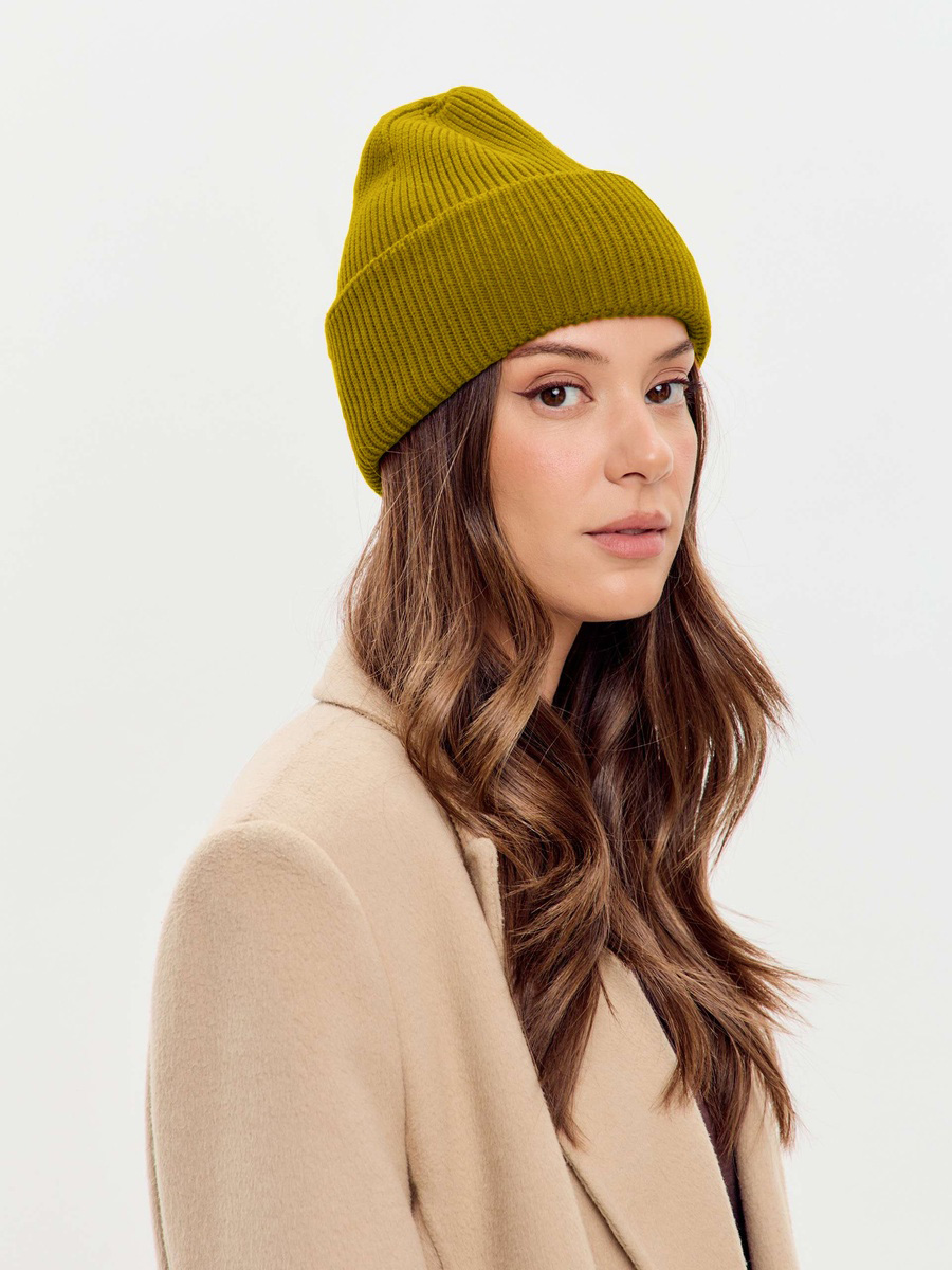 Женская шапка с отворотом, связана переплетением-резинка из полушерстяной пряжи. Глубина шапки около 22 см.