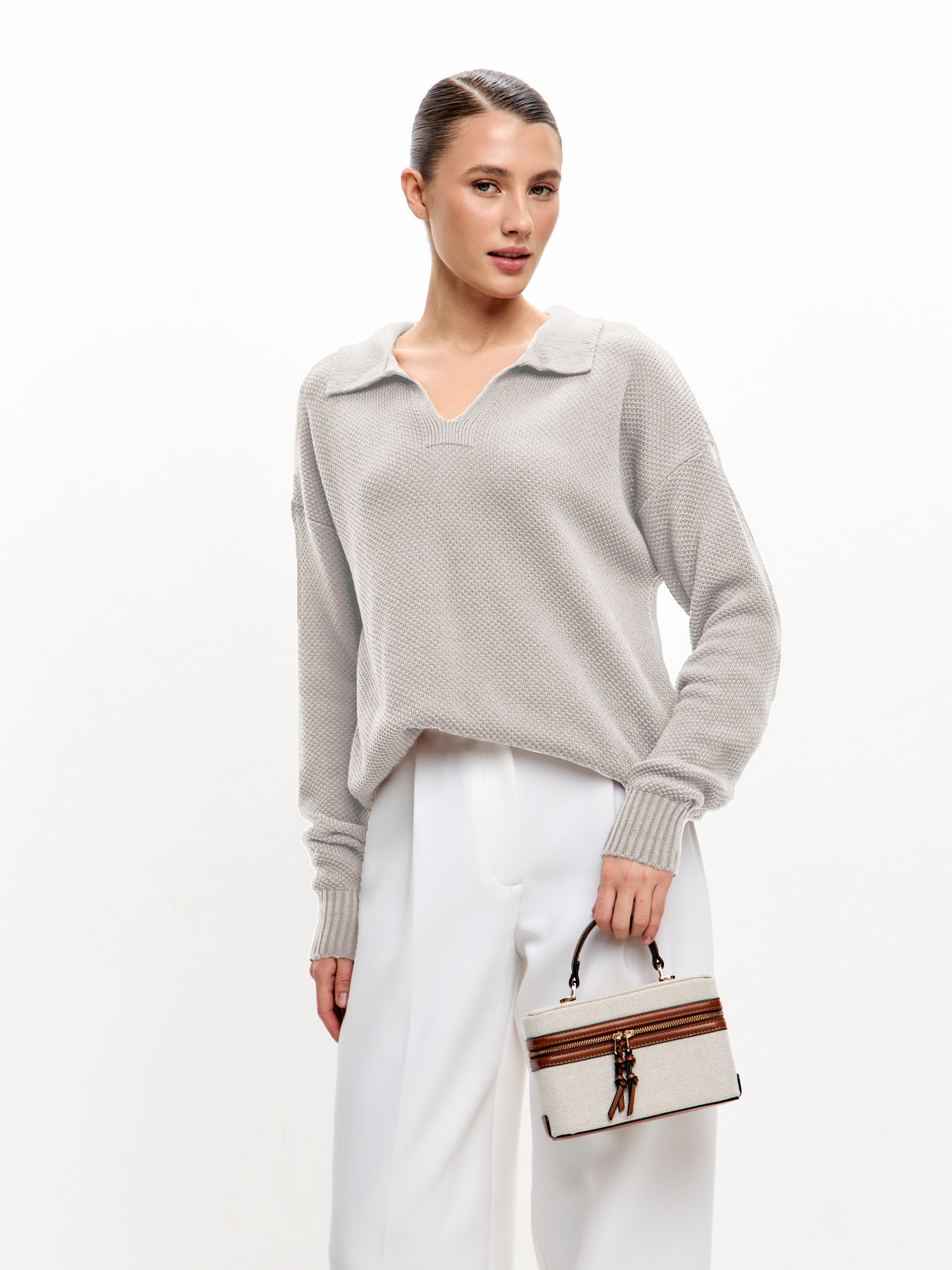 Женский джемпер-поло прямого силуэта связан структурным переплетением. Модель с длинными рукавами, круглой горловиной. Длина джемпера по спинке около 60 см. Рост модели 170 см.