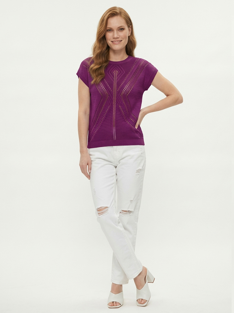 Ажурный женский джемпер "летучая мышь". Горловина - лодочка. Длина джемпера 46 размера по спинке около 54 см, 52 размера -58 см, 58 размера -60 см. Рост модели 175 см.