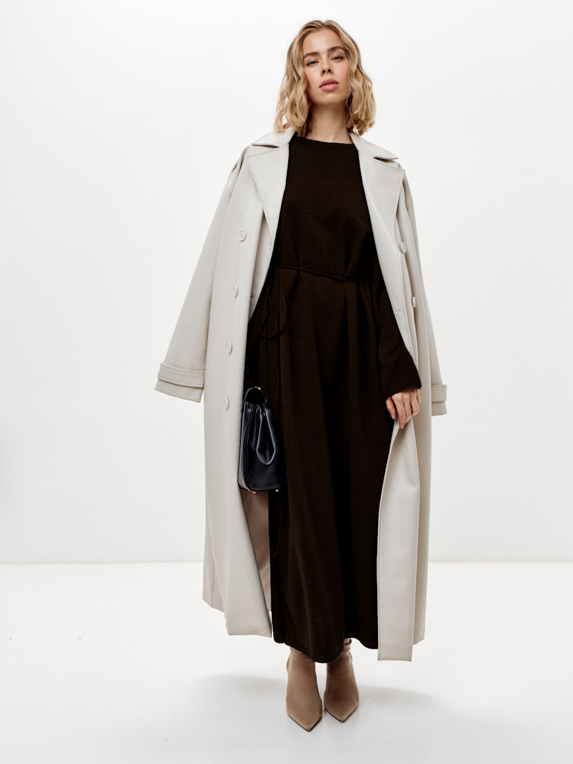 Платье женское "оверсайз" со спущенным плечом, зауженное к низу, с разрезом и кулиской на спине. Модель с длинными рукавами, круглой горловиной. Длина платья по спинке около 130 см.