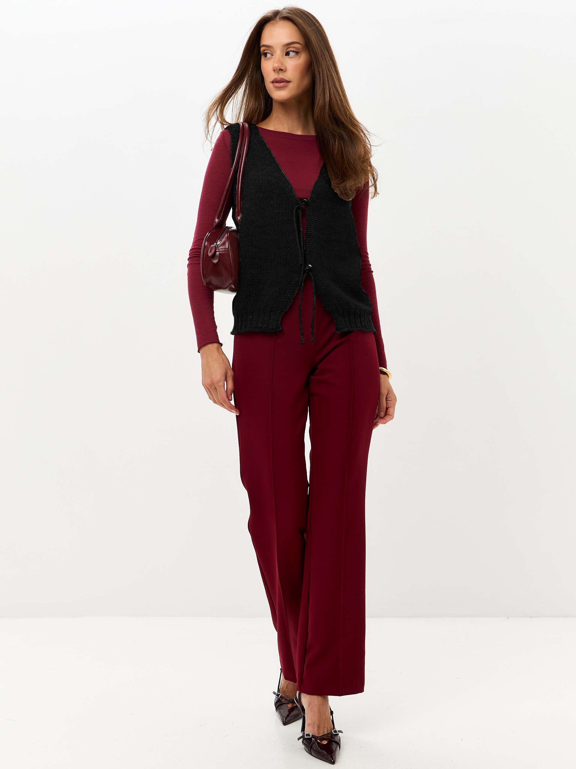 Жилет женский средней длины, связан структурным переплетением. Модель с горловиной на уголок, застёжкой на пуговицы. Длина жилета 46 размера около 50 см, 56 размера-56 см. Рост модели 175 см.