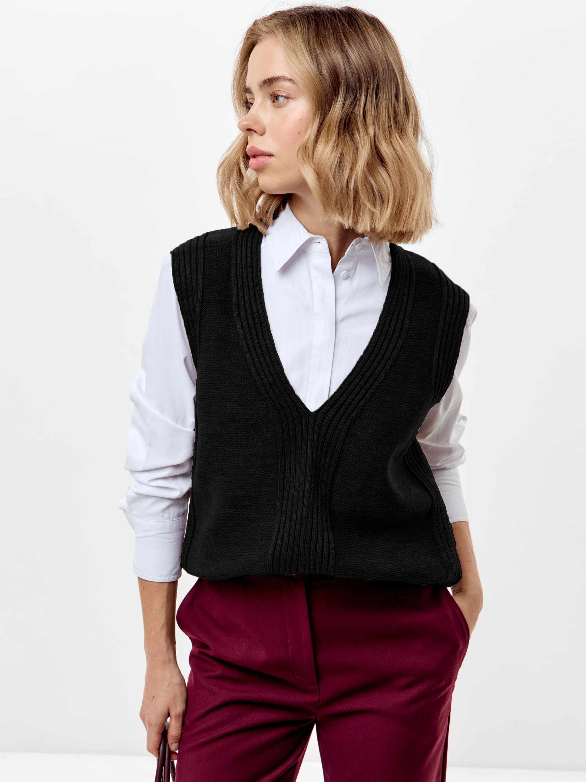 Жилет женский средней длины, прямого силуэта. Модель с горловиной на уголок. Длина по спинке 62 см. Ширина жилета по груди 46 размер-50 см, 50 размер-54 см, 54 размер-58 см. Рост модели 170 см.