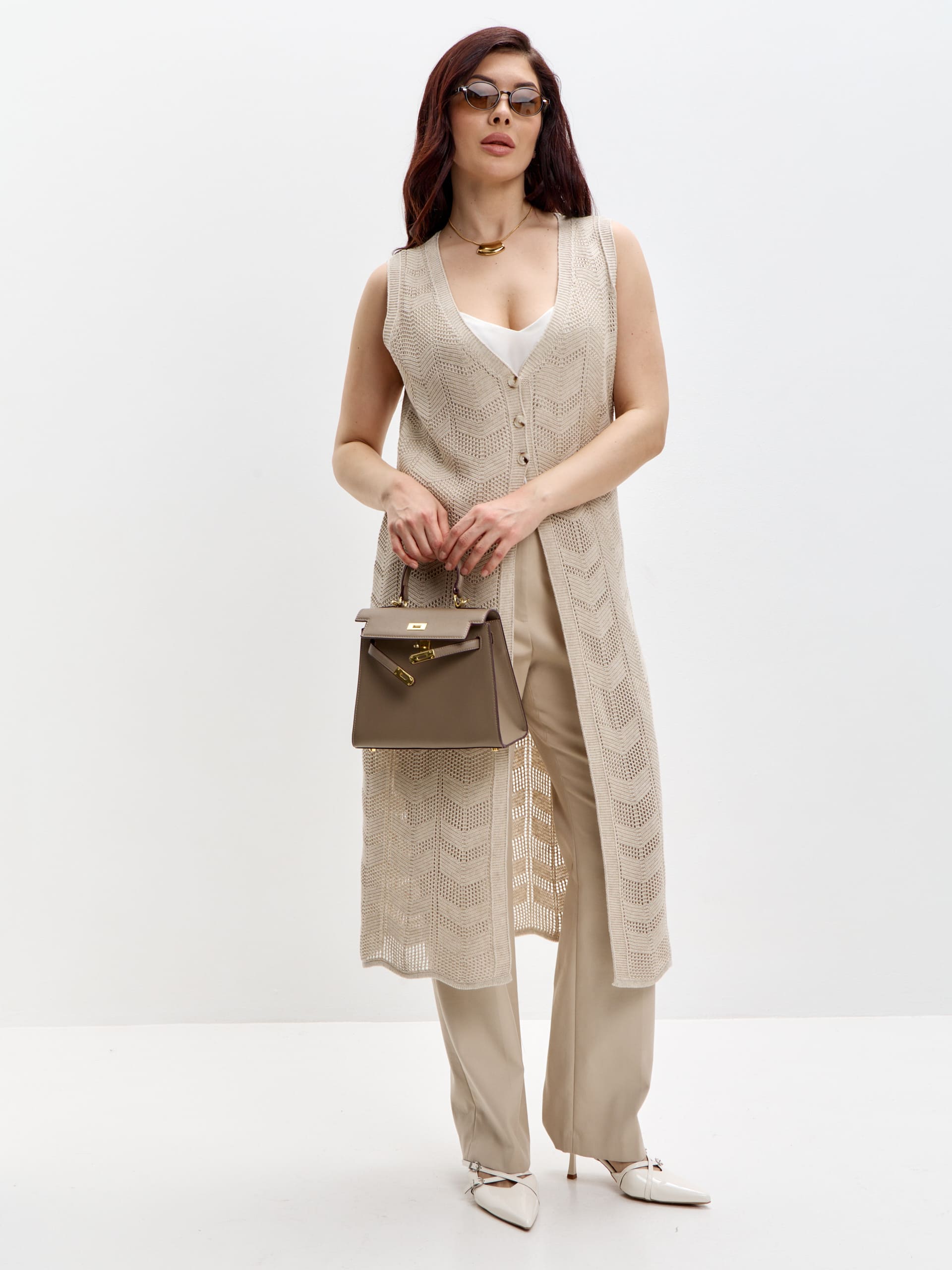 Жилет женский полуприлегающего силуэта с горловиной на уголок. Модель с застежкой на пуговицы. Длина жилета по спинке около 110 см. Рост модели 175 см.