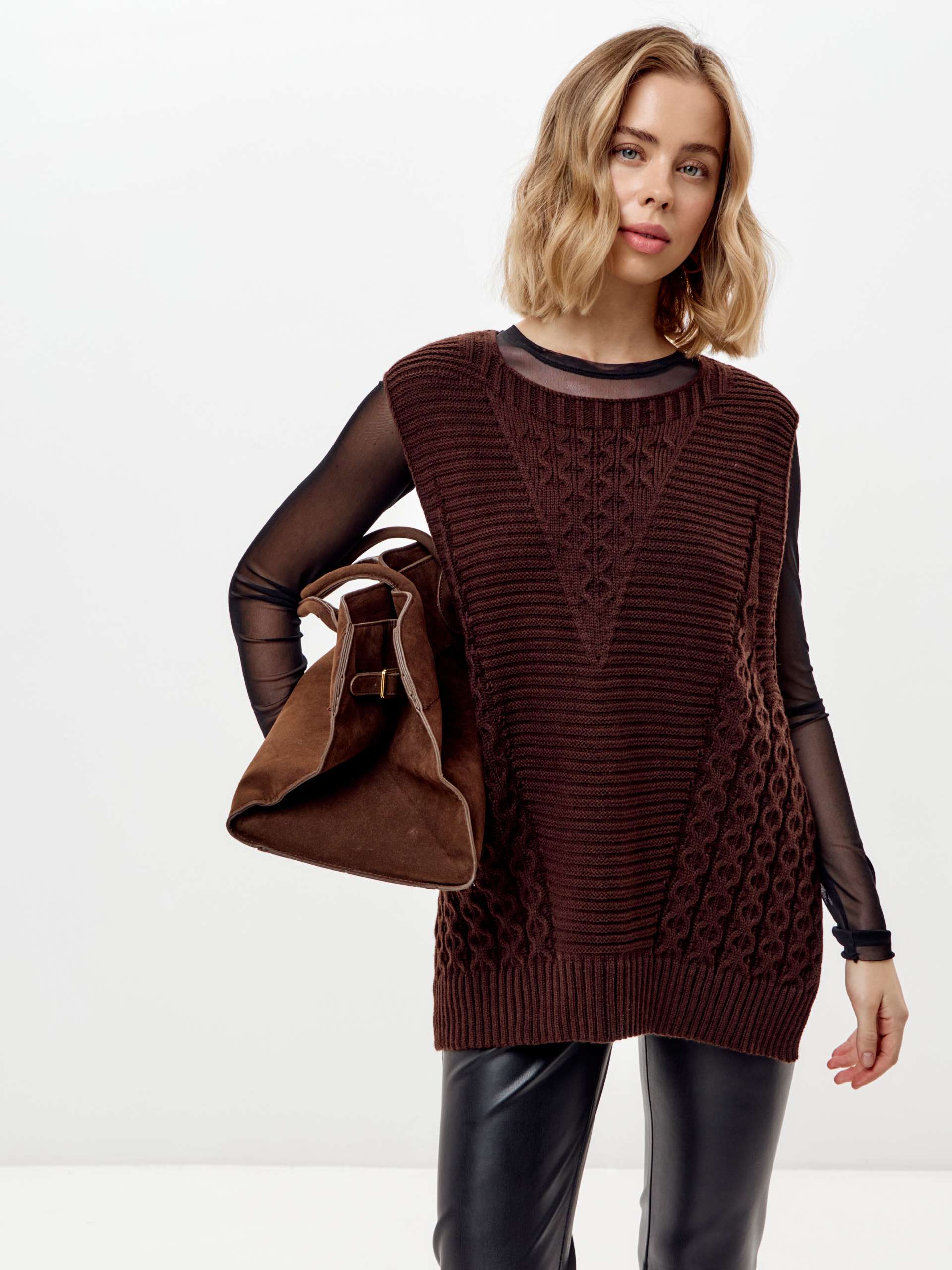 Женский жилет прямого силуэта с разрезами по бокам, связан структурным переплетением. Горловина - "лодочка". Длина по спинке 44 размера около 60 см, 54 размера - 66 см, 62 размера - 70 см. Рост модели 170 см.
