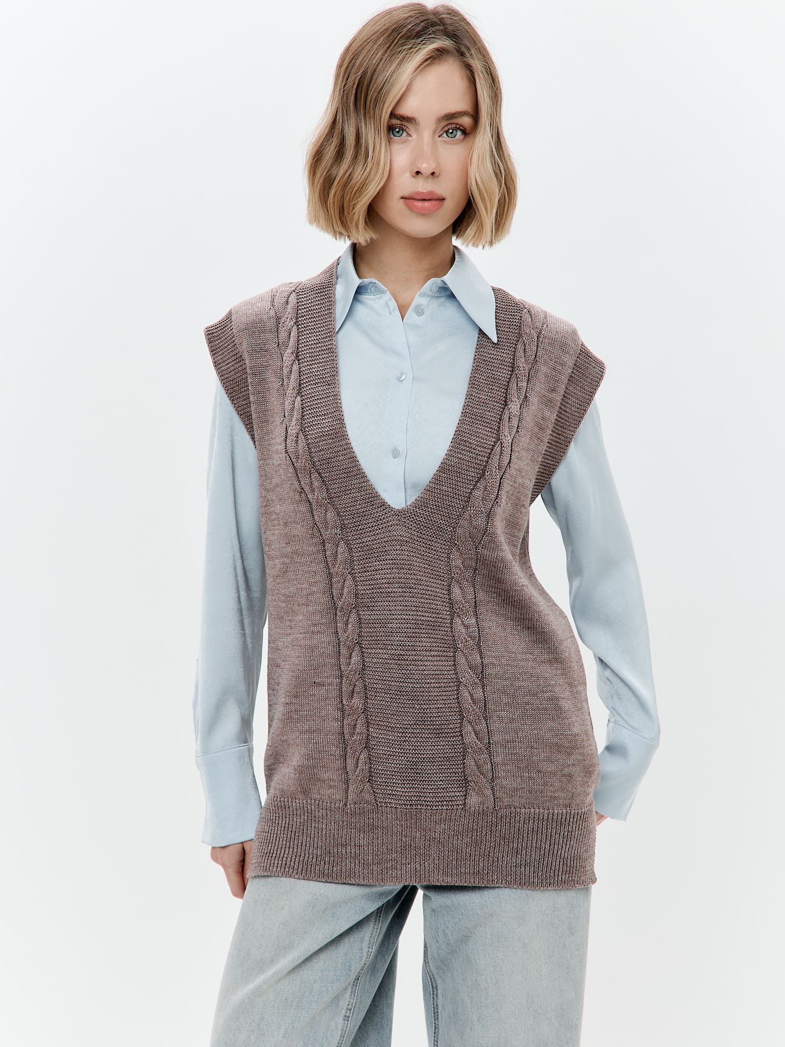 Женский жилет прямого силуэта с разрезами по бокам связан рельефным переплетением с косами. Модель с V-образной горловиной. Длина жилета по спинке около 66 см. Рост модели 170 см.