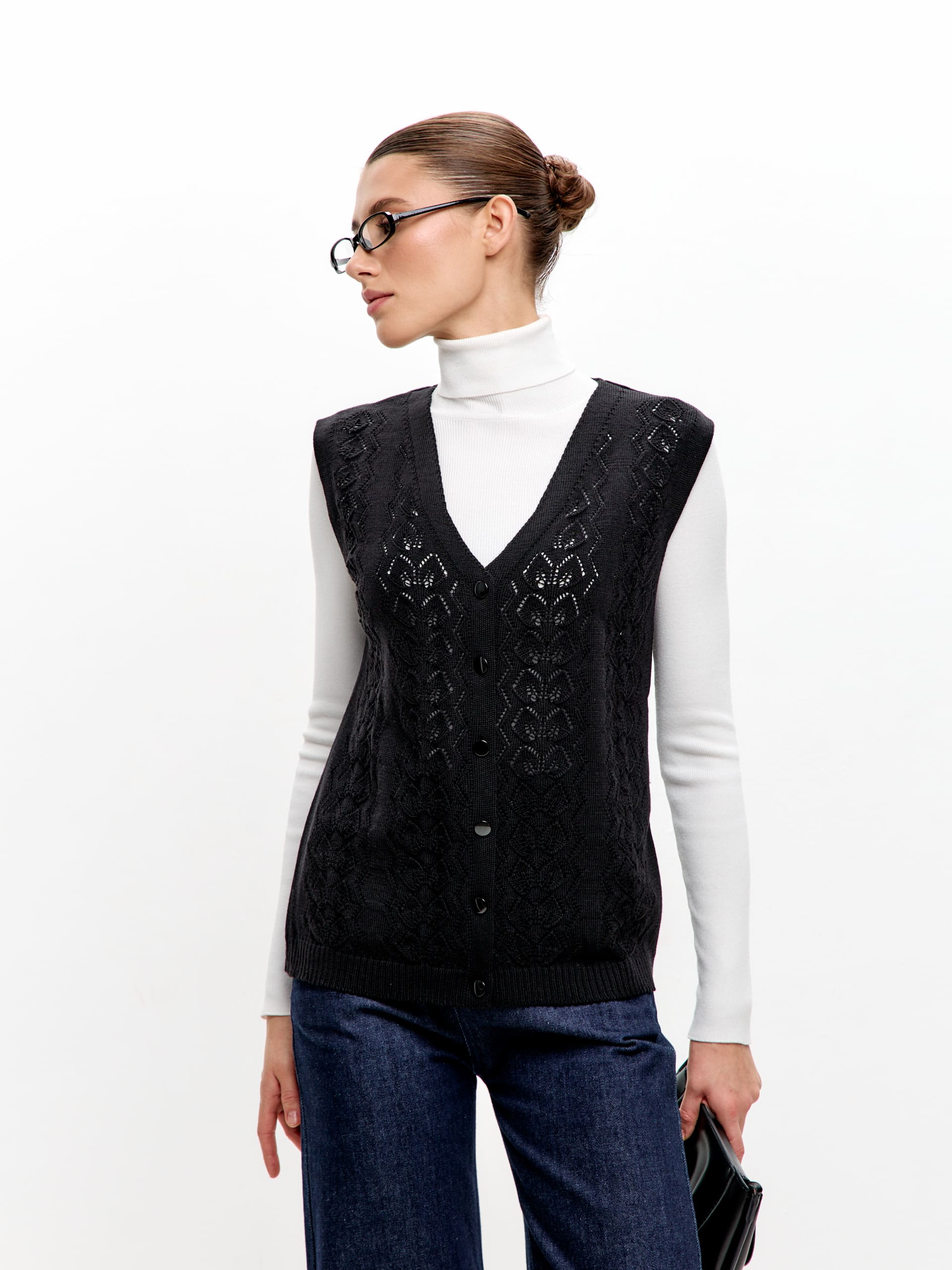 Женский ажурный жилет с застёжкой на пуговицы. Вырез горловины V-образный. Длина 48 размера около 60 см.